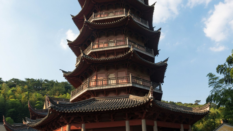 明代1468年日本画圣雪舟所绘的《育王山图》,曾画有三塔,“一寺拥三塔,三塔护一寺”。1992年重建,恢复历史古迹,东塔高53米,底直径11米,八面七层,重檐翘角。“敬心观塔,当愿众生:诸天及人,所共瞻仰。”